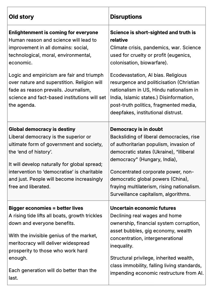 The table below spells out some of the “old stories” and how these are being undermined or disrupted.